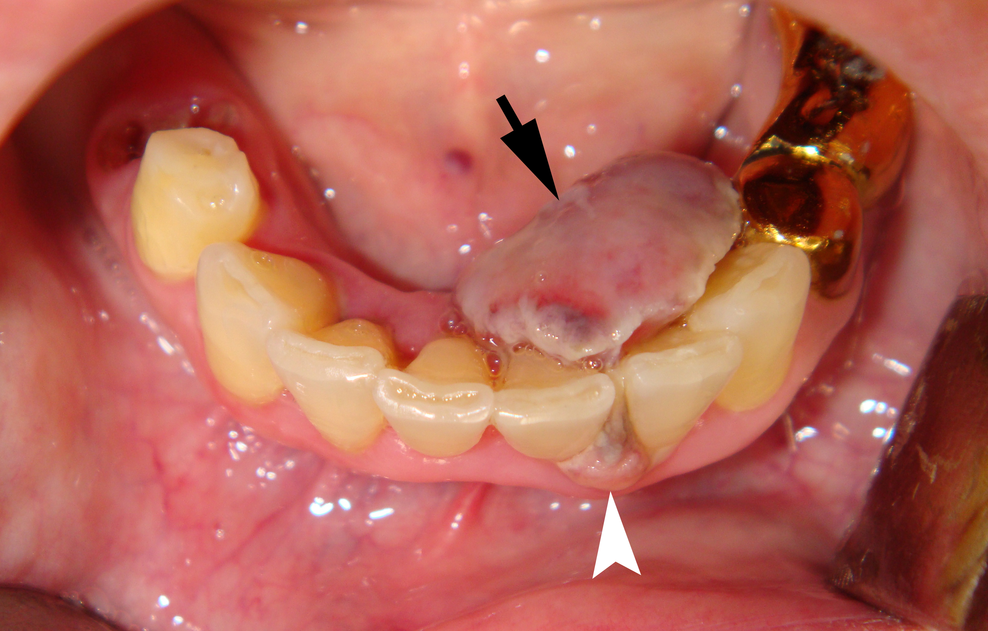 In May 19, 2015, a 49-year-old Caucasian female was referred to the Center of Maxillofacial Surgery and Dentistry with complaints of the presence of a neoplasm on the mucosa of the alveolar process of the mandible. According to the patient, this neoplasm has existed for the past few months and is growing. When taking the history, the patient did not mention any surgeries or treatments for RCC.