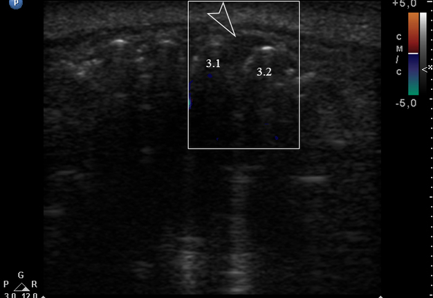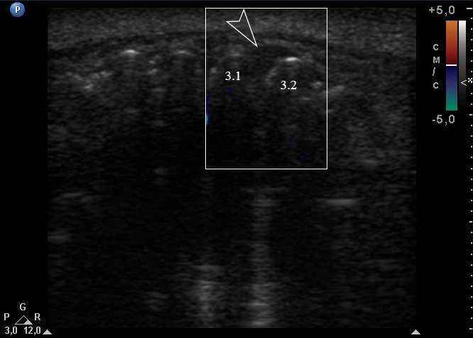 Anterior part of the neoplasm at the vestibular aspect of the lower teeth measured 0.34 x 0.38 cm (Fig 3). Upon the gray-scale USG the anterior part portion of the neoplasm vizualized as homogenous hypoechoic lesion with no signs of calcifications. Color Doppler USG showed no vascularity within the vestibular portion of the neoplasm (Fig 4).