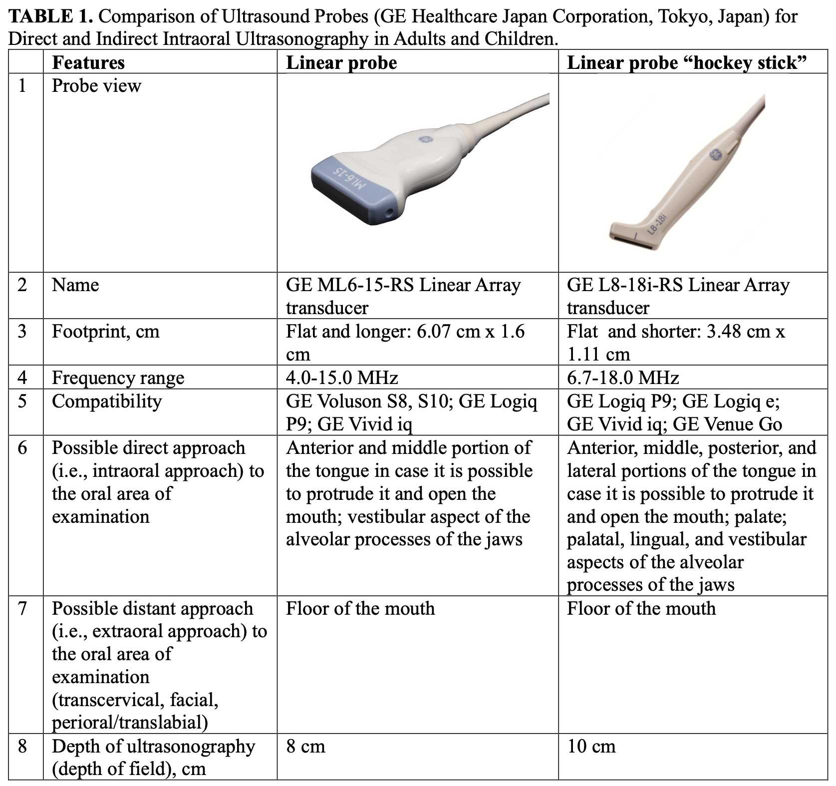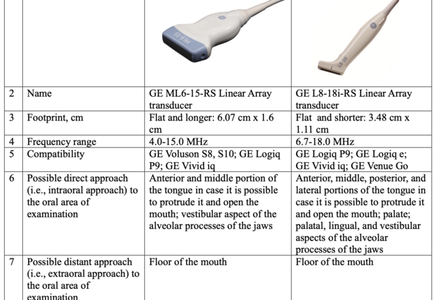 We consider it advisable and indication to use a hockey stick probe for intraoral ultrasound scanning of all intraoral lesions. A comparison of the characteristics of linear and hockey-stick probes from one manufacturer, namely GE (GE Healthcare Japan Corporation, Tokyo, Japan), is presented in Table 1.