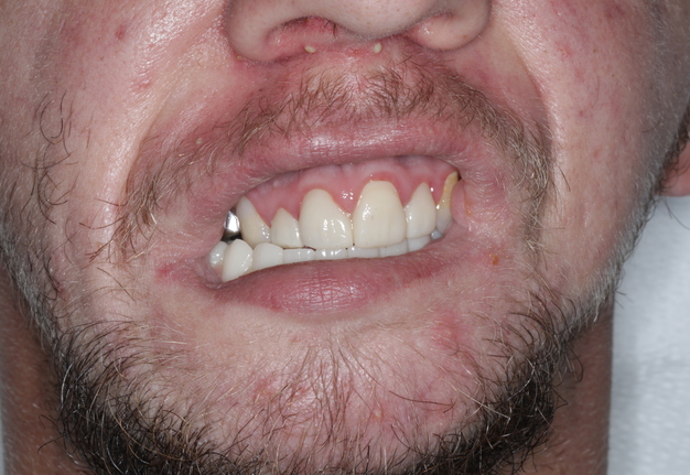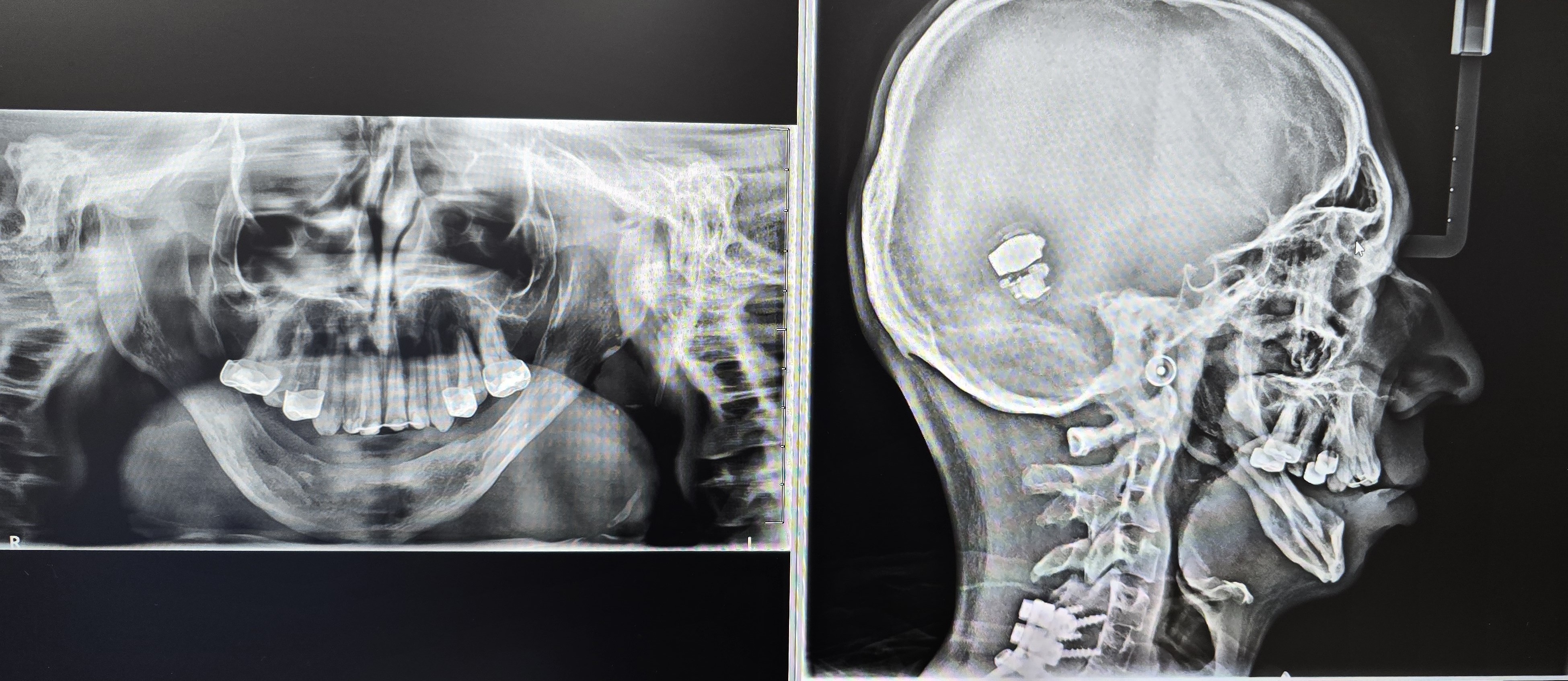 A 21-year-old male with CCMS presented with complete mandibular edentulism, severe mandibular atrophy, and limited oral opening. Retained maxillary dentition was present.
