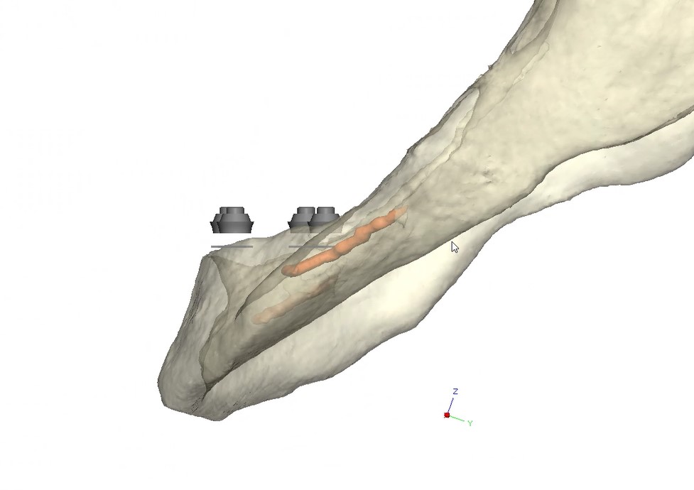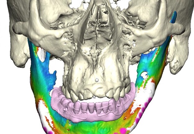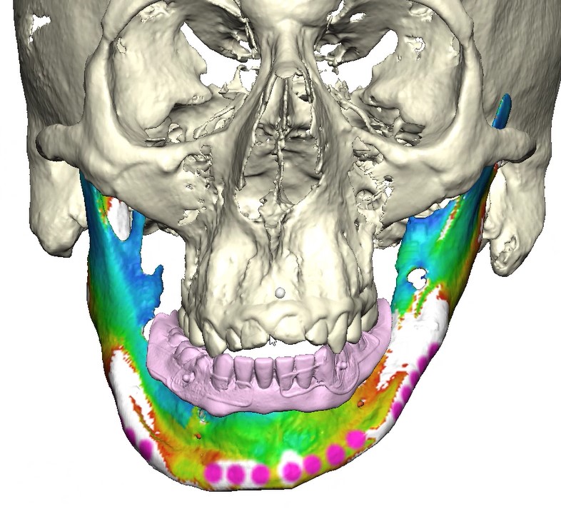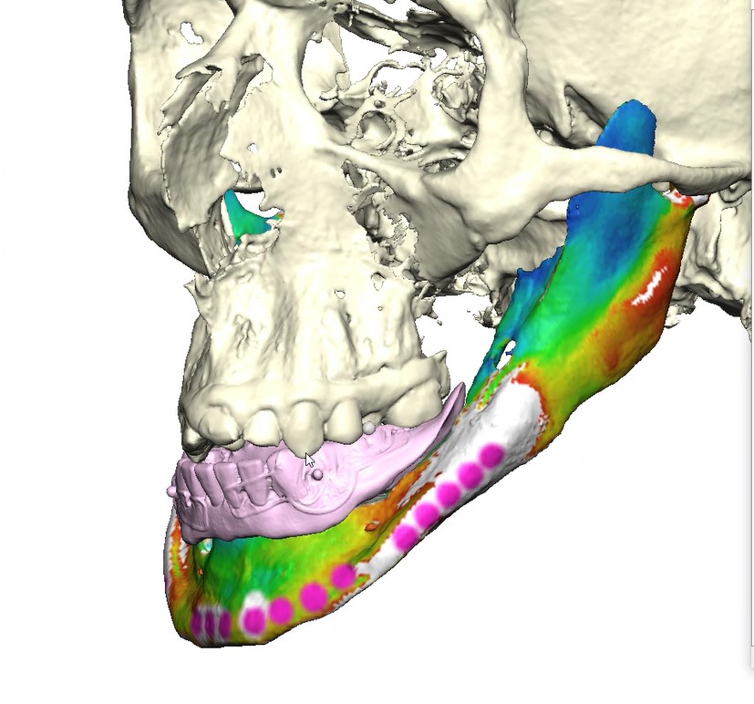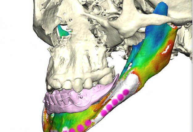 Under general anesthesia in an operating room setting, a crestal incision with bilateral releasing incisions was made on the mandible. Subperiosteal dissection extended to the inferior border of the mandible while preserving both mental nerves. A CAD-CAM bone reduction guide was rigidly fixated and used to perform alveoloplasty and predict fixation sites.