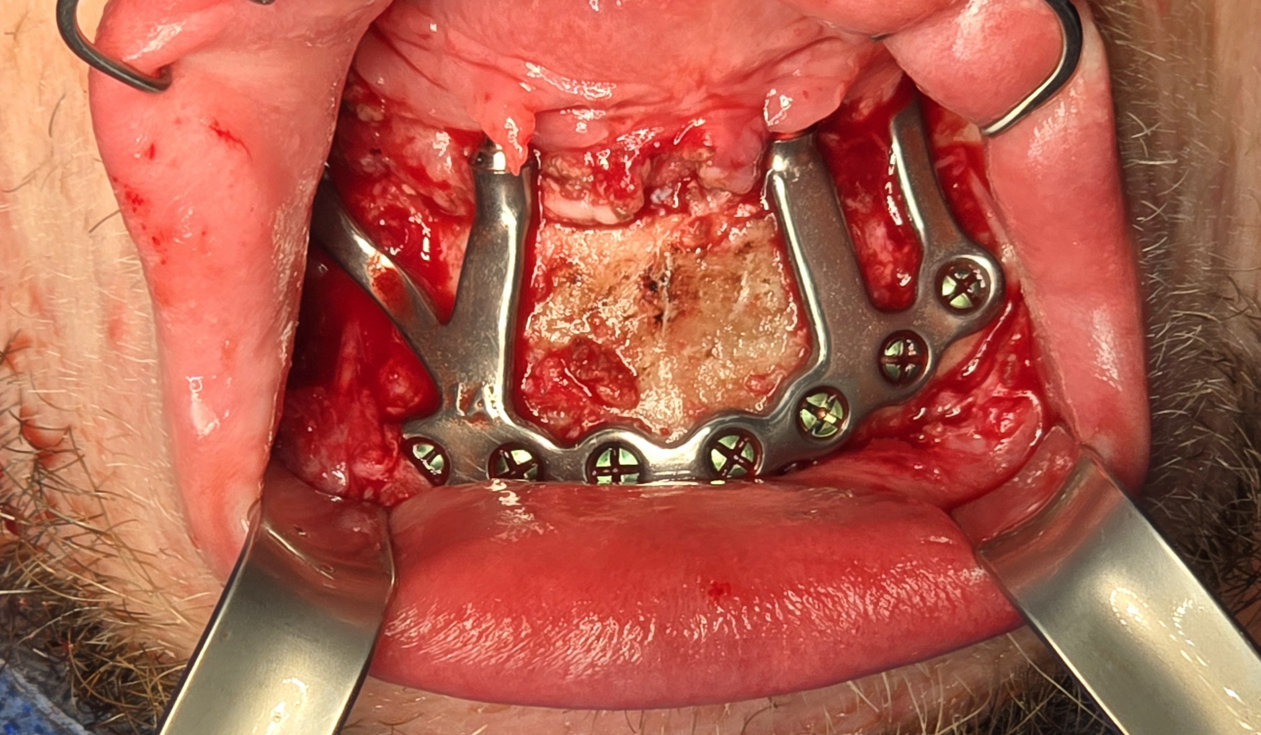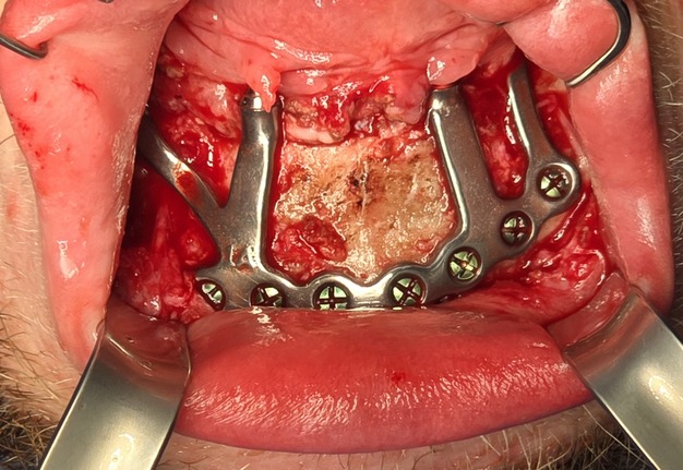 Due to the patient’s trismus, a transbuccal trocar system was used bilaterally to access posterior fixation sites, a technique commonly used in limited access mandibular fixation [17]. Locking screws were. placed under copious irrigation to achieve rigid stabilization (Fig 8).