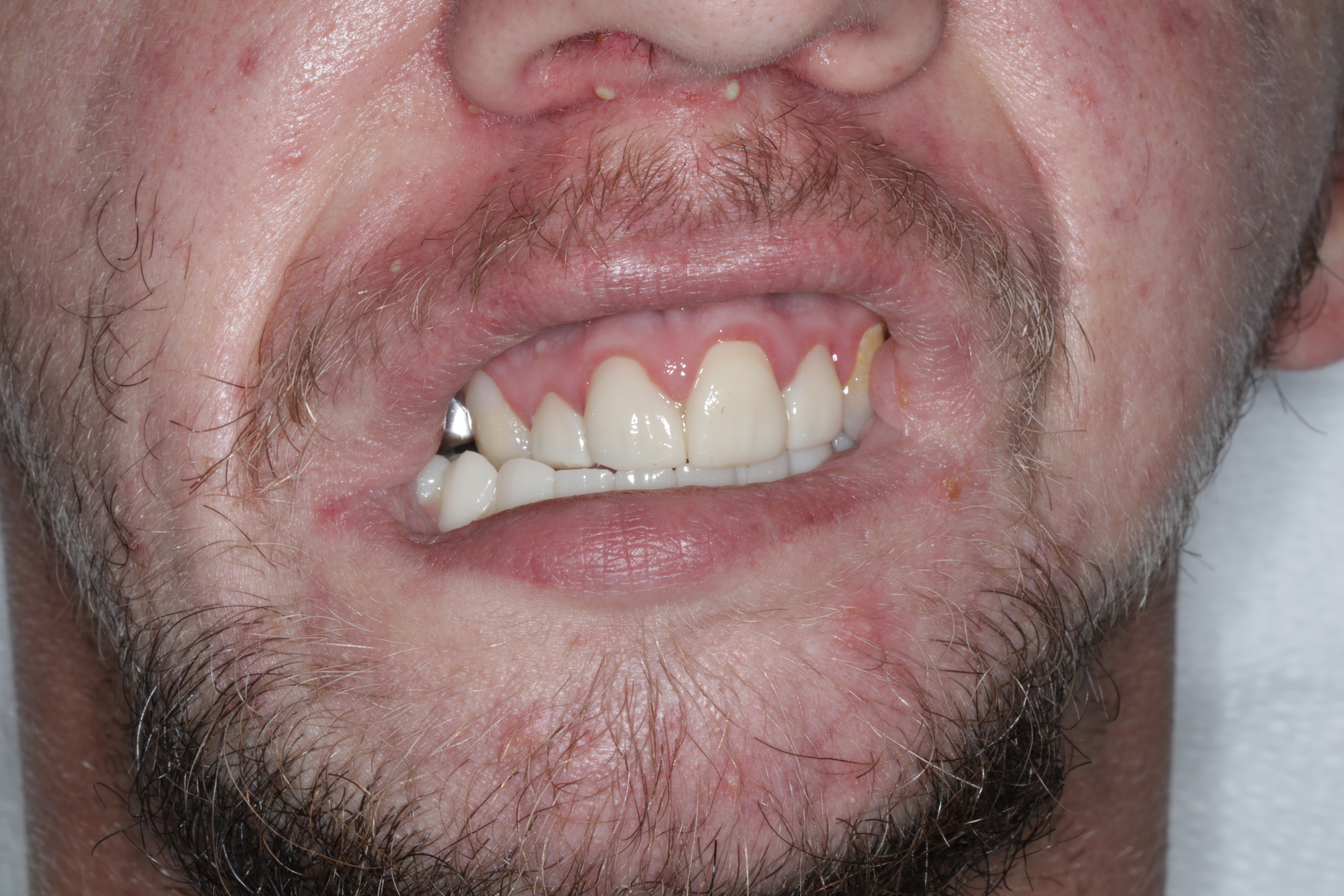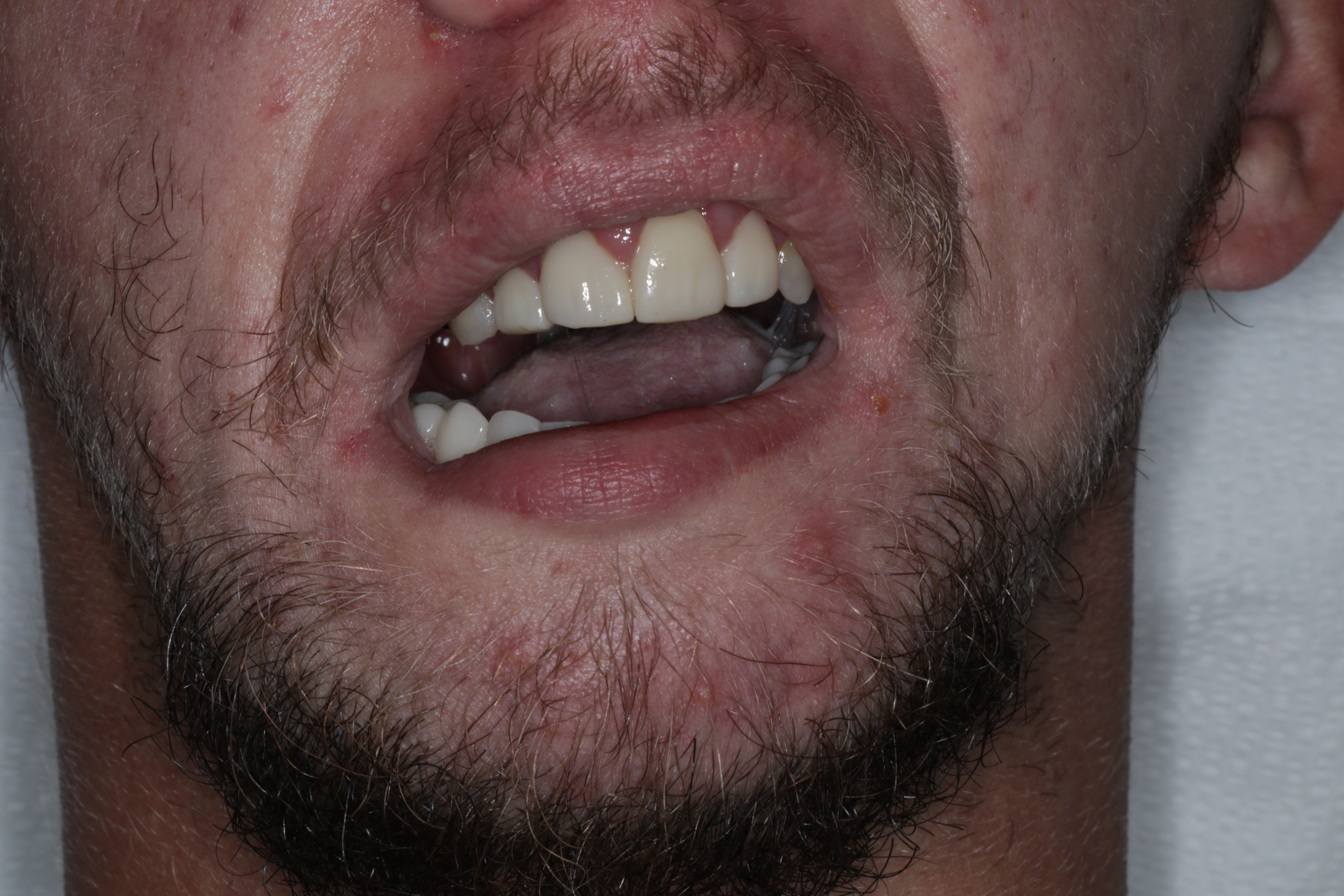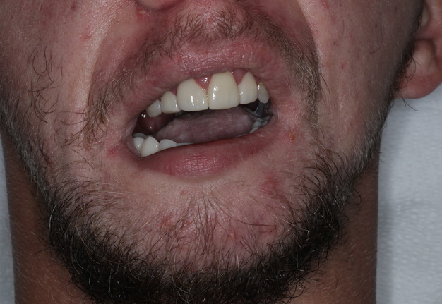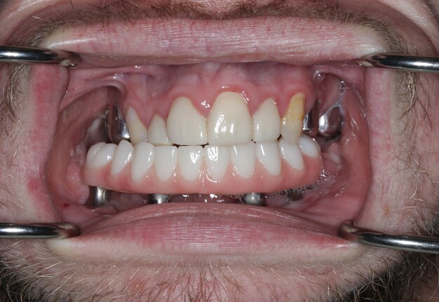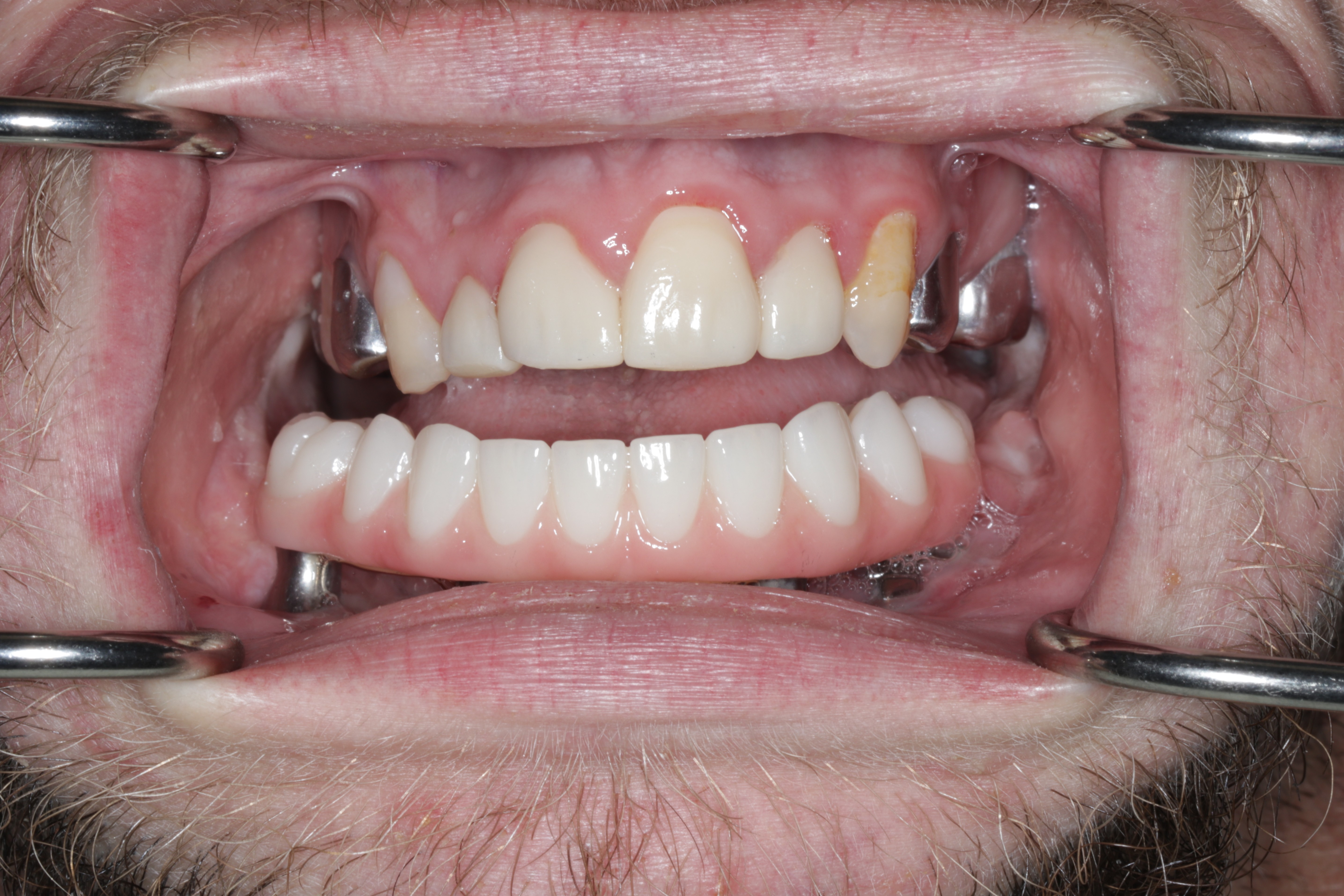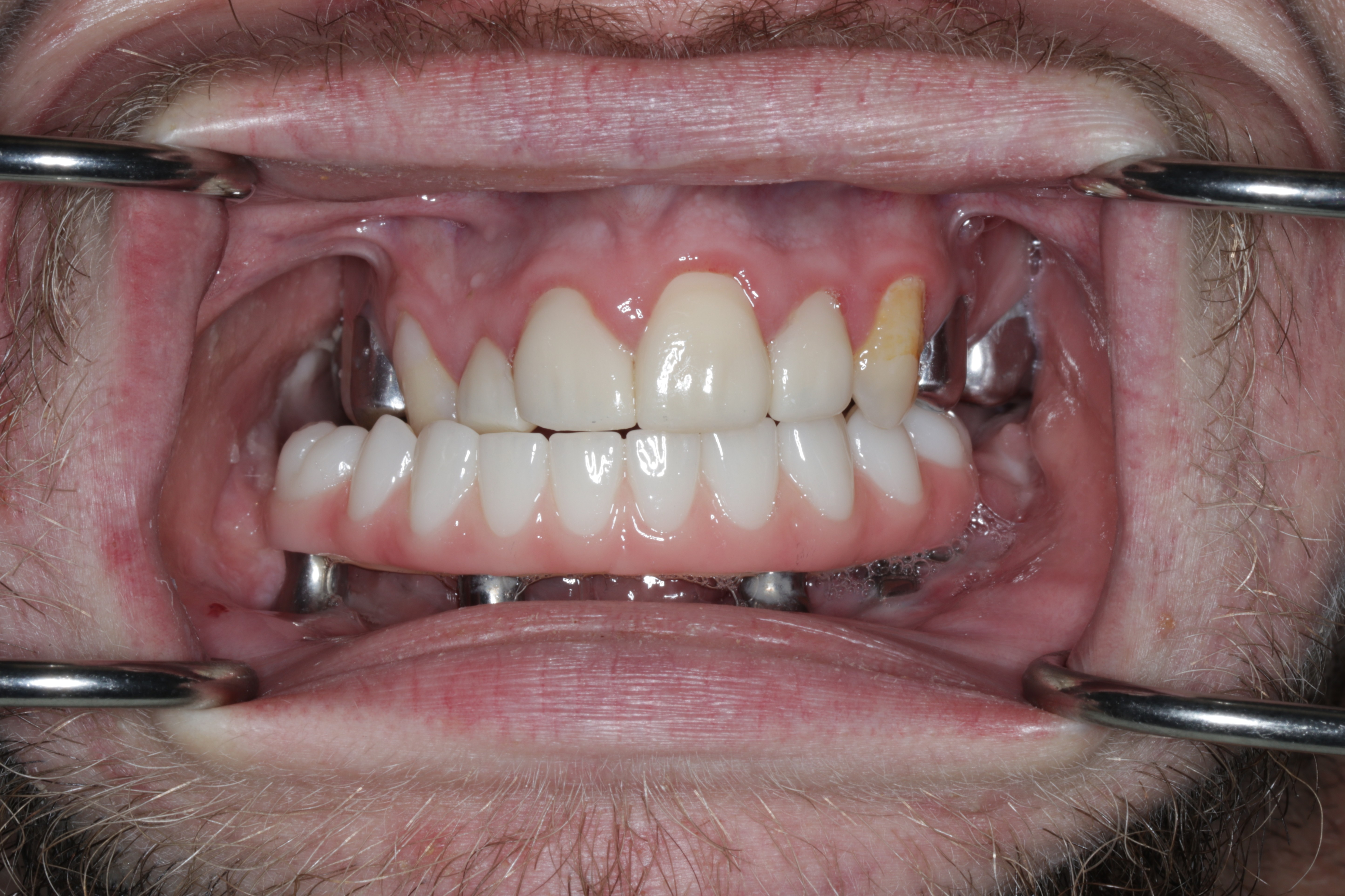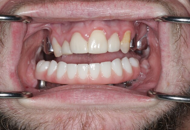 Verification of passive seating, which could not be performed radiographically due to the inability to fit x-ray films intraorally, was carried out by visual confirmation on the fabricated physical cast followed by intraoral verification. The full arch implant supported fixed prosthesis was fully seated with no rocking or movement. A high-water design was utilized for enhanced hygiene, eliminating the need for tissue capturing and moulage. Passiveness was verified visually and tactically using a new sharp probe, with no evident gap. A one-screw test was performed to ensure there was no elevation on the opposite end. A screw resistance test was also performed, with all Vortex screws hand-tightened due to the inability to insert a torque wrench intraorally.