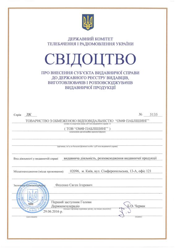The company received a Certificate (Fig 12) of inclusion of a publishing entity in the state register of publishers, manufacturers and distributors of publishing products. Issued by the State Committee for Television and Radio Broadcasting of Ukraine on June 29, 2016 (download PDF).