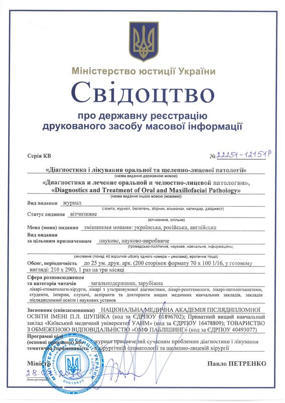 FIGURE 1. Certificate of State Registration of the Diagnostics and Treatment of Oral and Maxillofacial Pathology journal in the Ministry of Justice of Ukraine as of July 28, 2016.